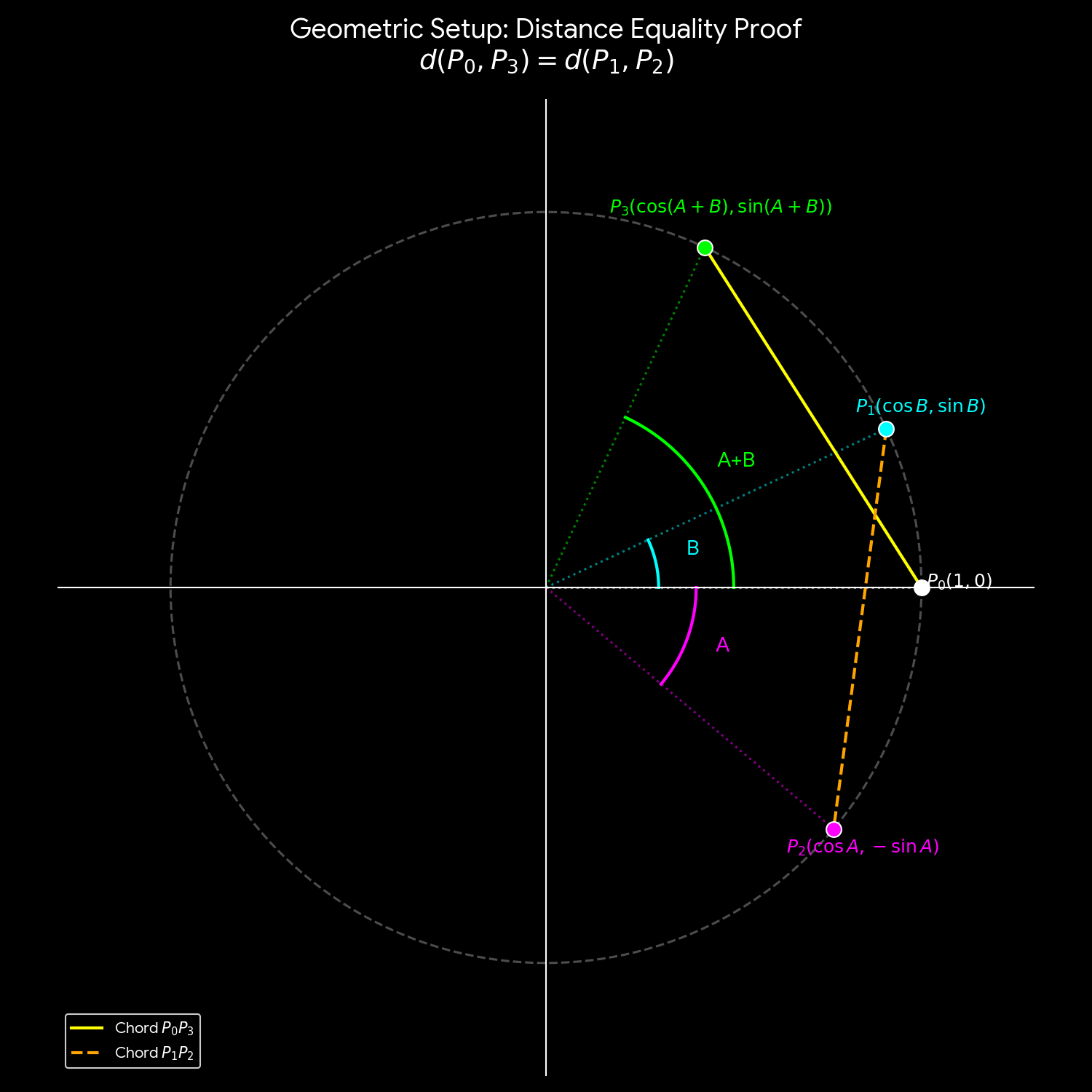 $$\text{Point } P_3: \text{At angle } A+B \implies (x, y) = (\cos(A+B), \sin(A+B))$$