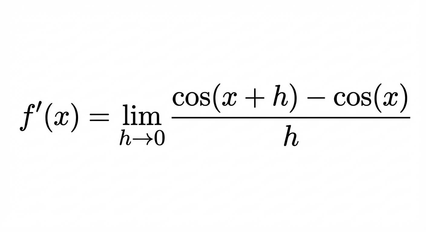 $$\large \boxed {f'(x) = \lim_{h \to 0} \frac{\cos(x + h) - \cos(x)}{h}}$$