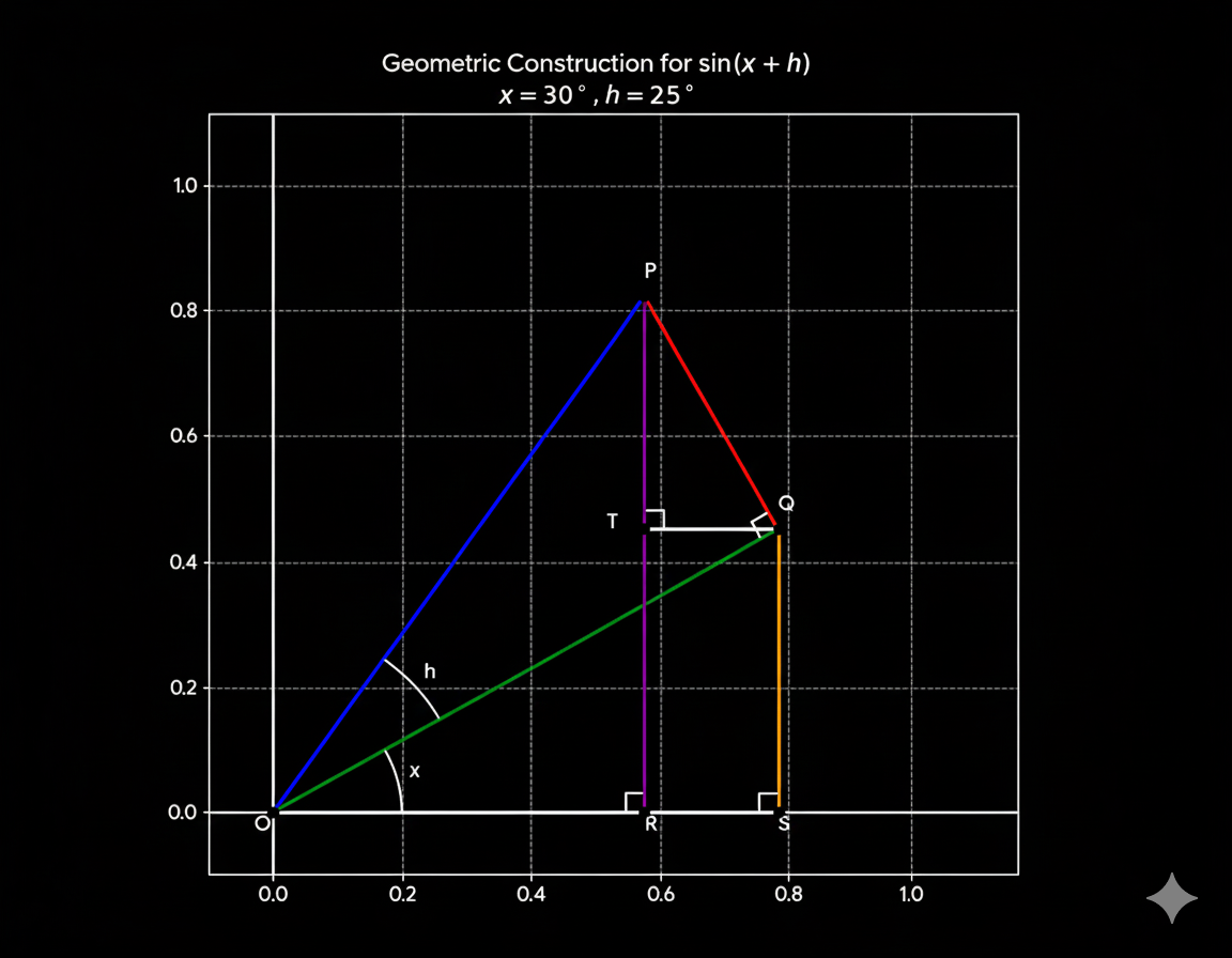 &\text{Drop a perpendicular from } P \text{ to the } x\text{-axis at point } R\text{. } PR \text{ is our goal, because } PR = \sin(x+h)\text{.} \\