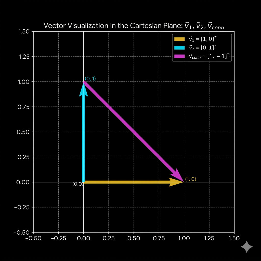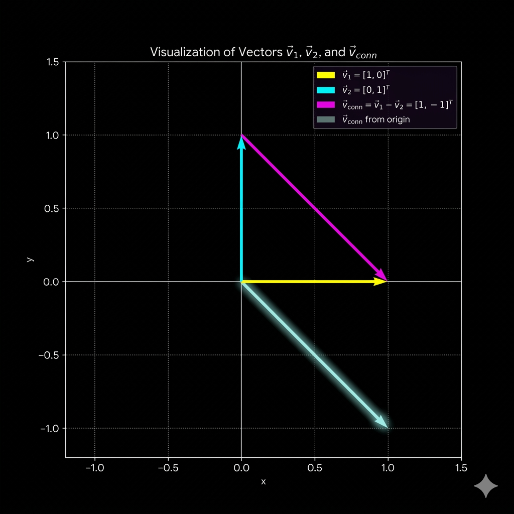 $$\vec{v}_{conn} = \begin{bmatrix} 1 \\ 0 \end{bmatrix} - \begin{bmatrix} 0 \\ 1 \end{bmatrix} = \begin{bmatrix} 1 \\ -1 \end{bmatrix}$$